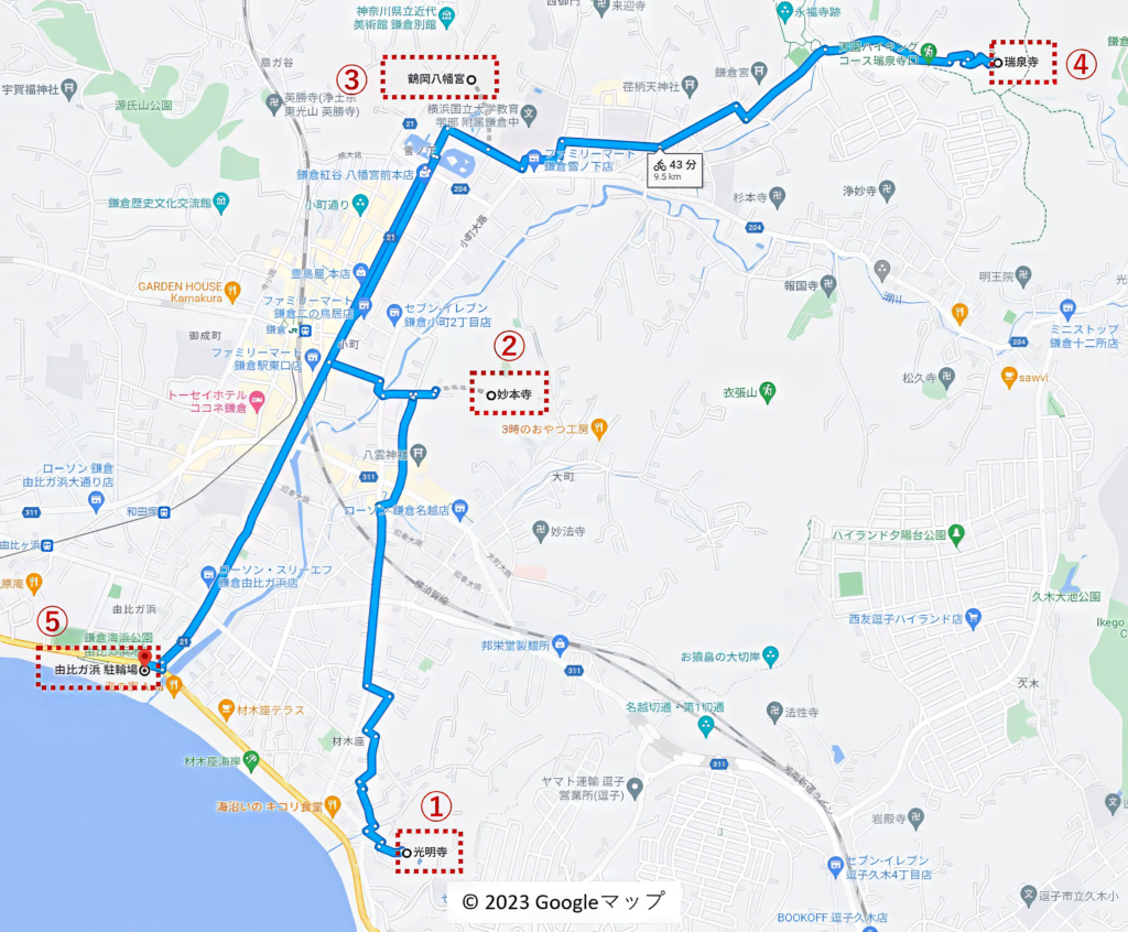 次の地図が自転車で巡ったコースで、最初は光明寺に行き、その後、妙本寺、鶴岡八幡宮、瑞泉寺へと行きました。