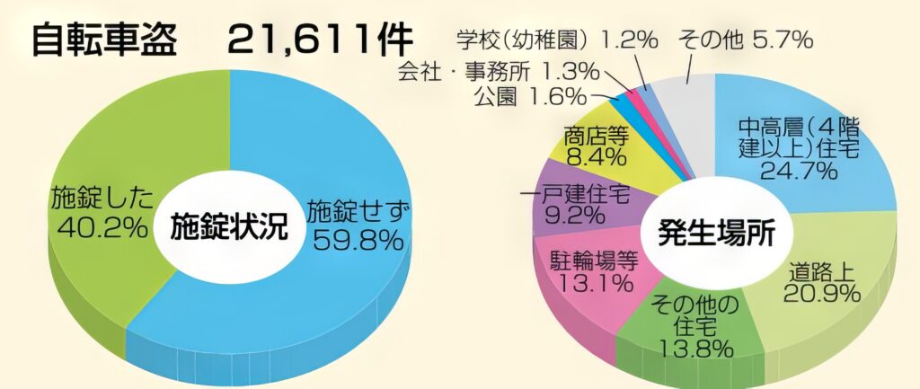 左側の円グラフのように、「施錠せず」の件数がやはり多いですが、「施錠した」のにも関わらず自転車を盗られた人が4割もいるので、鍵をかけたら安心というわけではないということです。