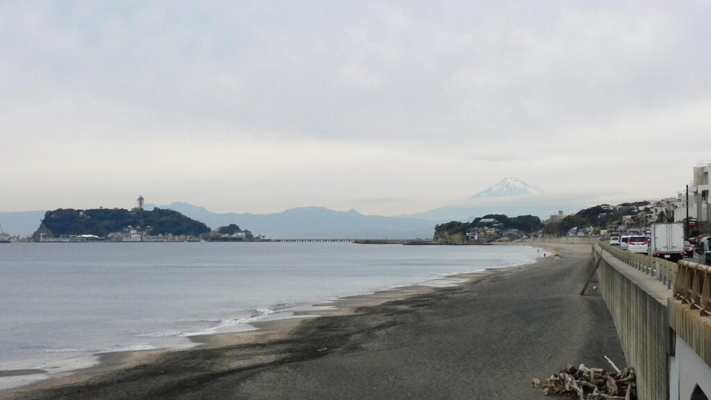 次の写真は帰り道に見た富士山と江の島です。