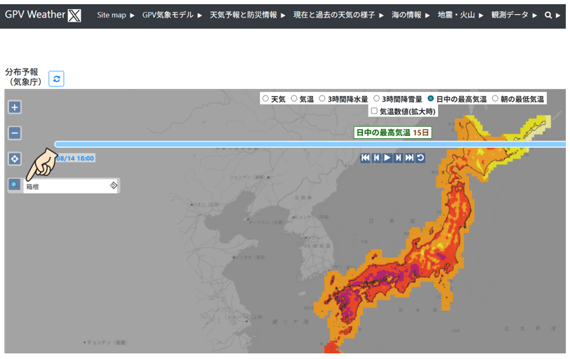 以上のようにして、日中最高気温に関する画面が出ますので、次に調べたい地点を探す方法を紹介します。