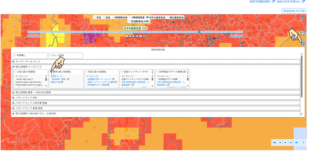 先程の最高気温の地図のように、全体に真っ赤で地名や道路が見づらいときは、他のボタンを押してみましょう。