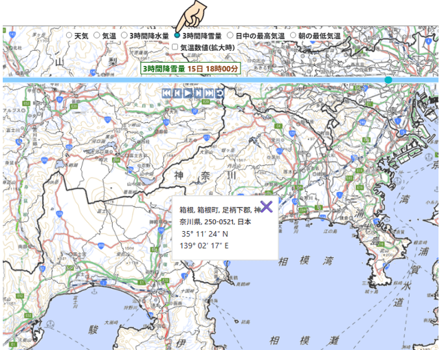 例えば、「3時間降雪量」のボタンをクリックすると、夏に雪は降らないので、今、どこの地図を見ているのかが分かりやすくなります。
