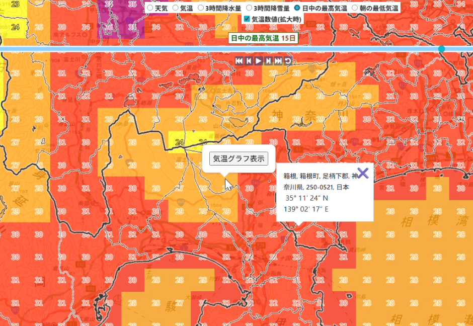 たとえば、私が住む神奈川県内の各地の日中最高気温予想をGPVでチェックしたところ、平地や盆地は35℃以上がずらりと並び、箱根や山北町周辺だけが30〜35℃であることが分かりました(次の画像)。