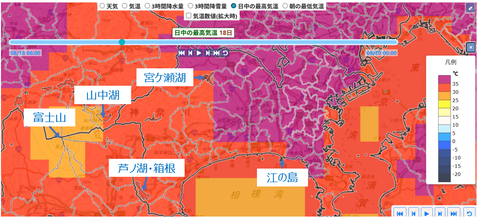 そこで神奈川県外まで見渡してみると、静岡県御殿場市から富士山や山中湖方面にかけての一帯が30℃を下回る涼しさを示していました。