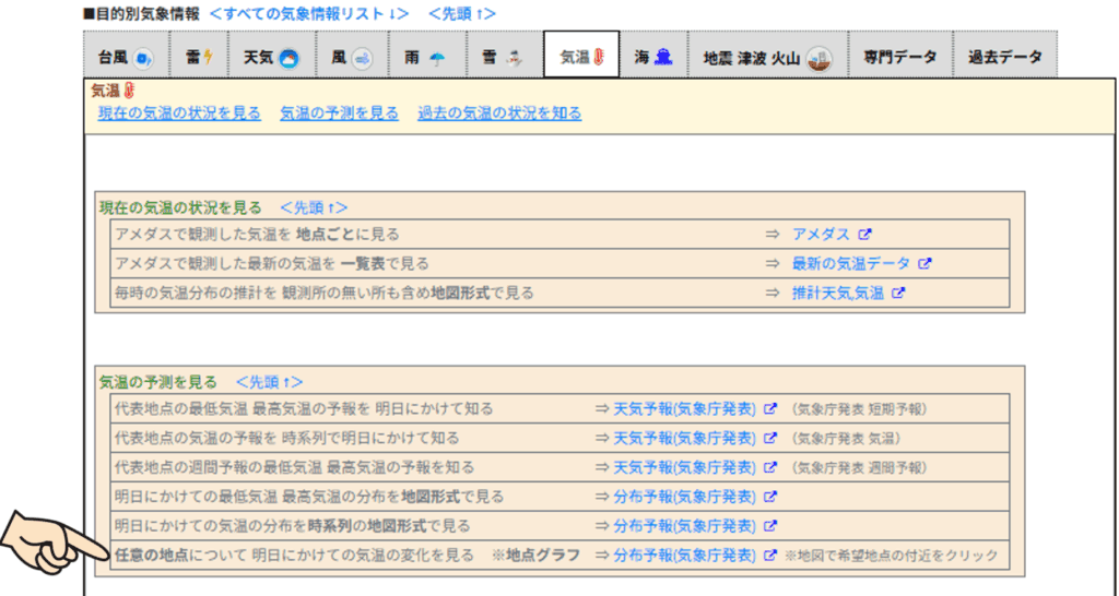 そうすると次の画面が表示されるので、「任意の地点について、明日にかけての気温の変化を見る ※地点グラフ ⇒分布予報(気象庁発表)」のところをクリックします。