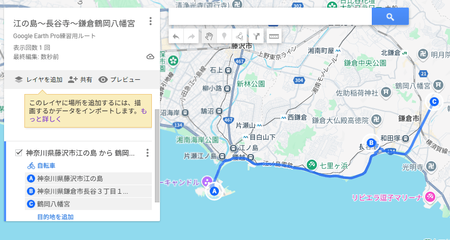 ここで、「場所」パネルを見ると、出発地(江の島)⇒目的地(鶴岡八幡宮)⇒経由地(長谷寺)⇒ランドマーク(鎌倉高校前駅)の順に並んでおり、ルートの地理的な順になっていません(次の画像)。