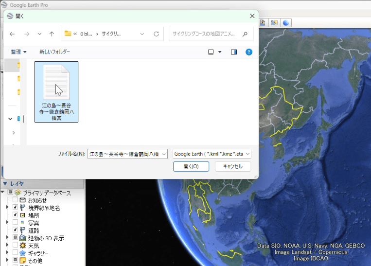 先程、作成したルート情報を含むKMLファイルを指定して読み込ませます(次の画像)。