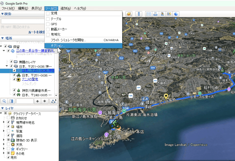 カメラの設定を変更するには、Google Earth Proの上部メニューから「ツール」→「オプション」と選びます(次の画像)。