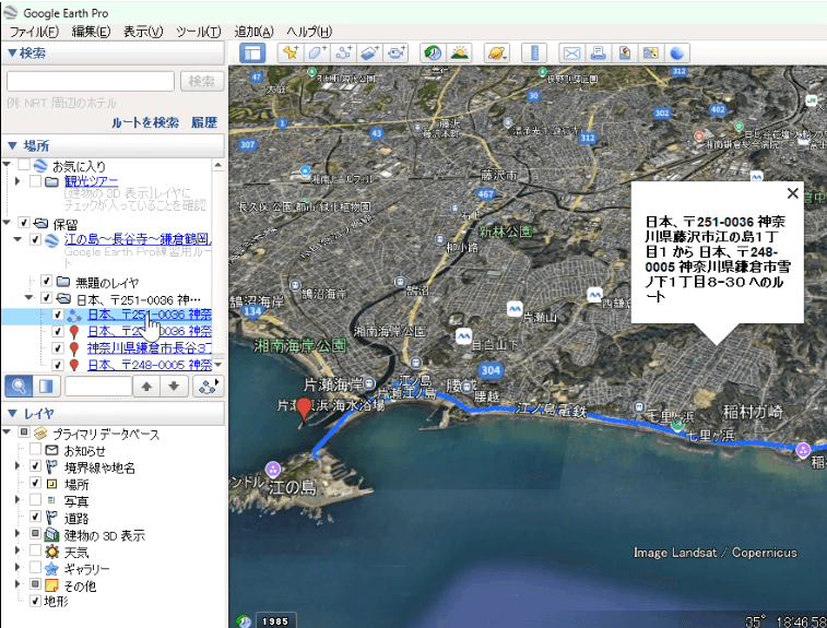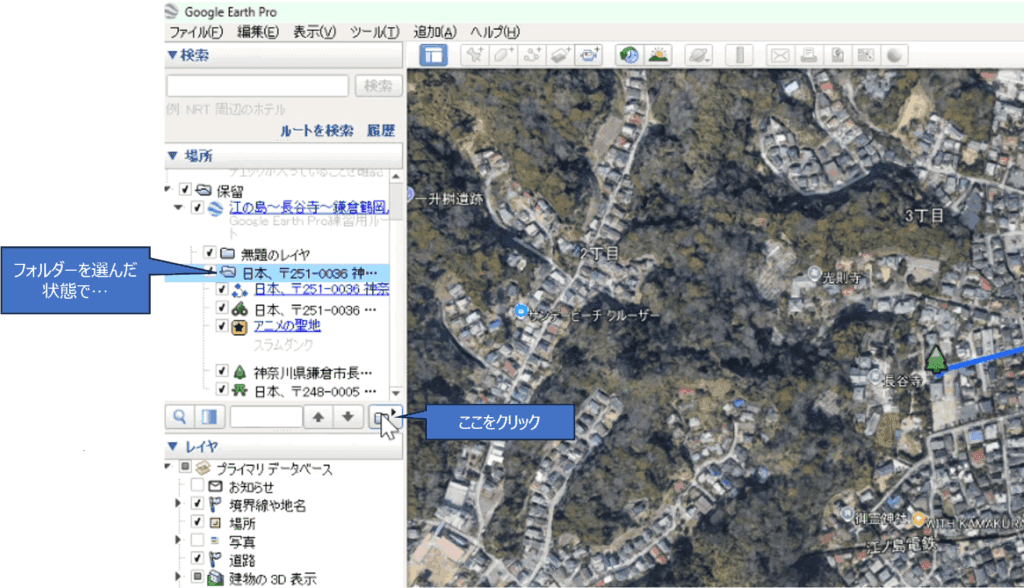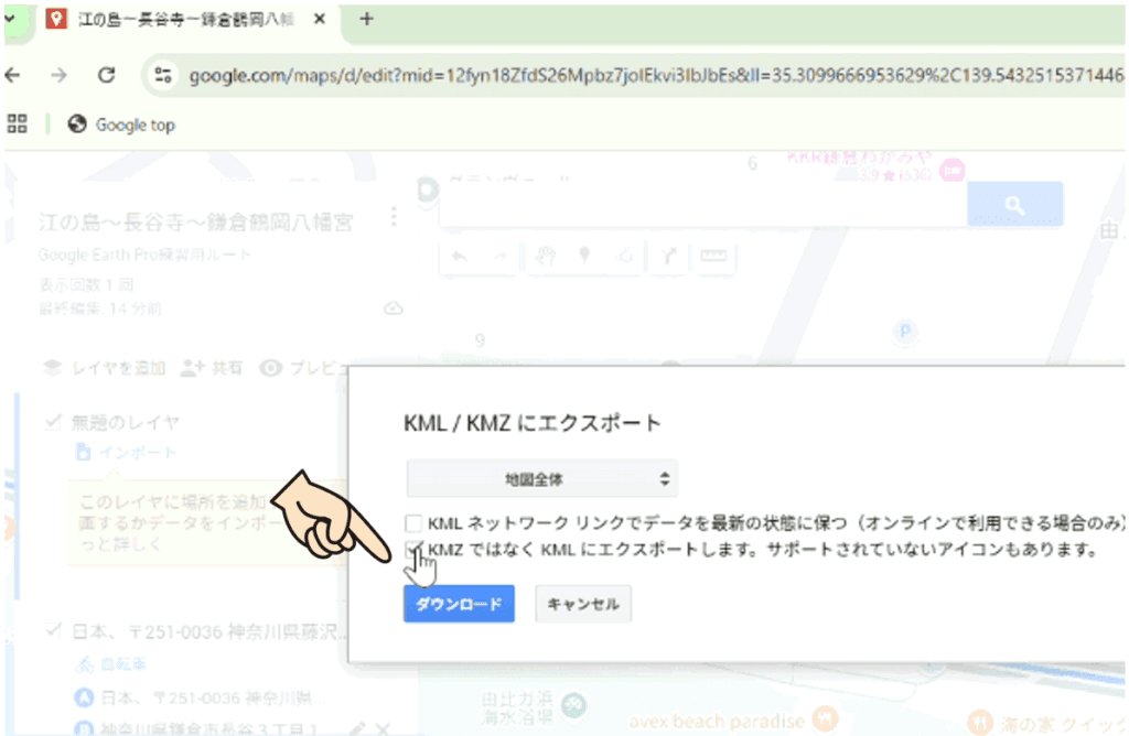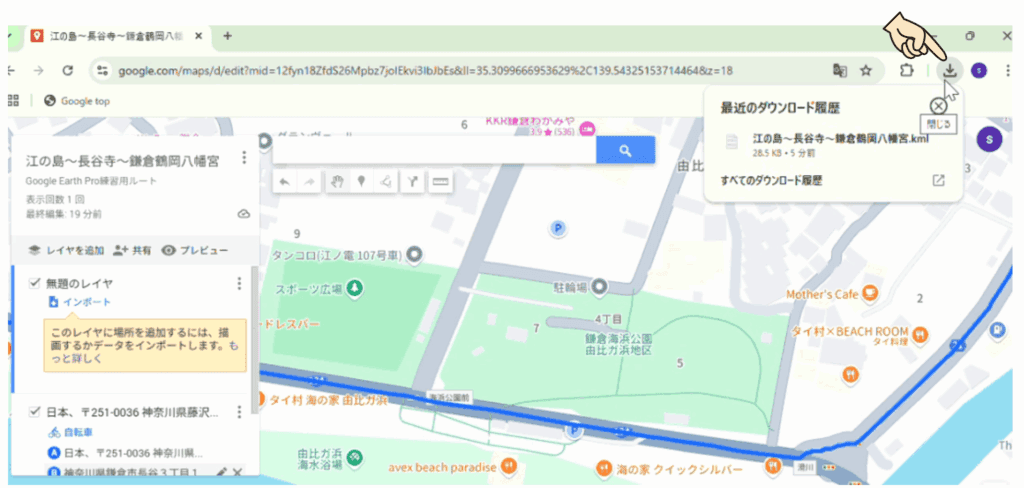この例の場合、“江の島~長谷寺~鎌倉鶴岡八幡宮.kml”というファイルがダウンロード先のフォルダーに作成されます。
