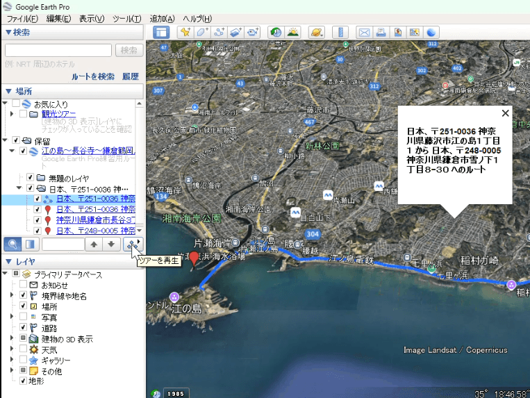 | ④ | Google Earth Pro | 「ツアーの再生」でルートを空撮風に表示 | ルートをクリック →「ツアーを再生」 |