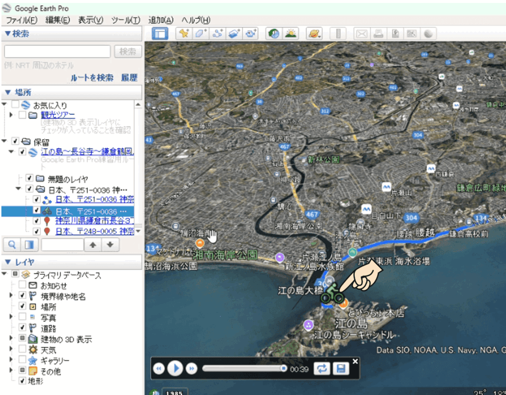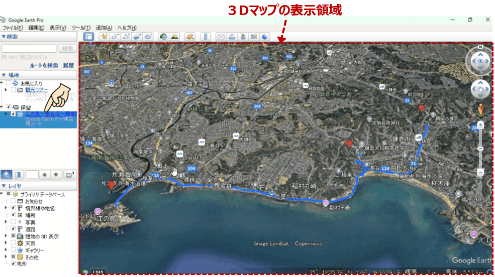正しく読み込まれると、左側の「場所」パネルにルート情報が表示され(次の画像の指差しているところ)、3Dマップ上にルート線が描かれます。