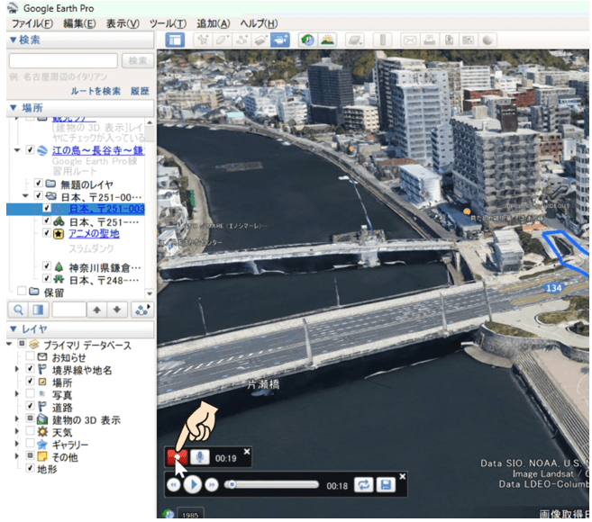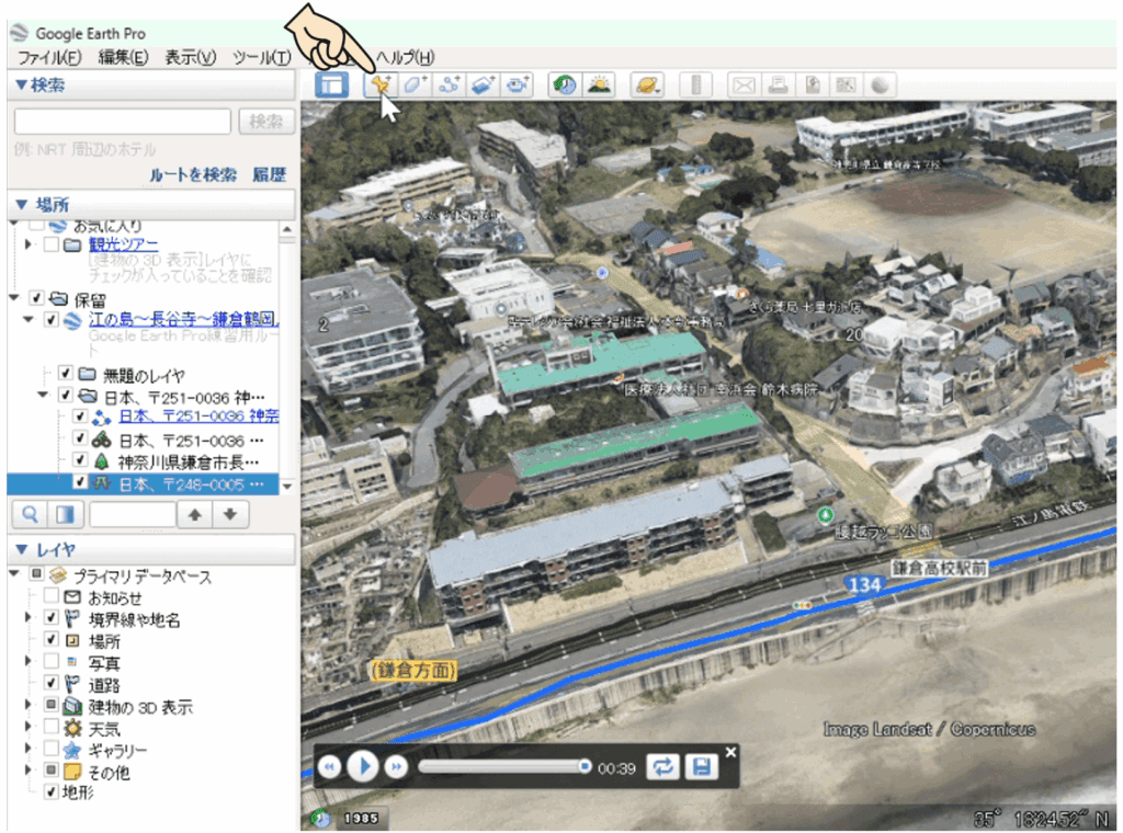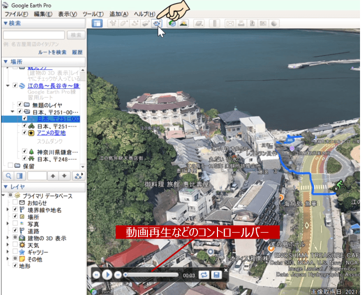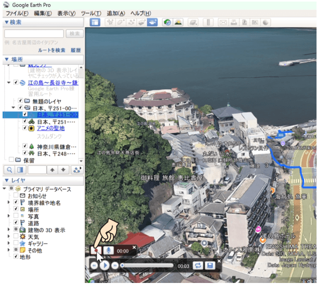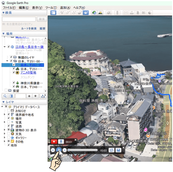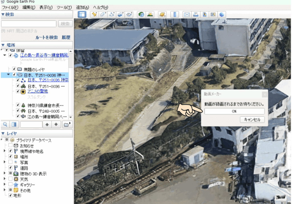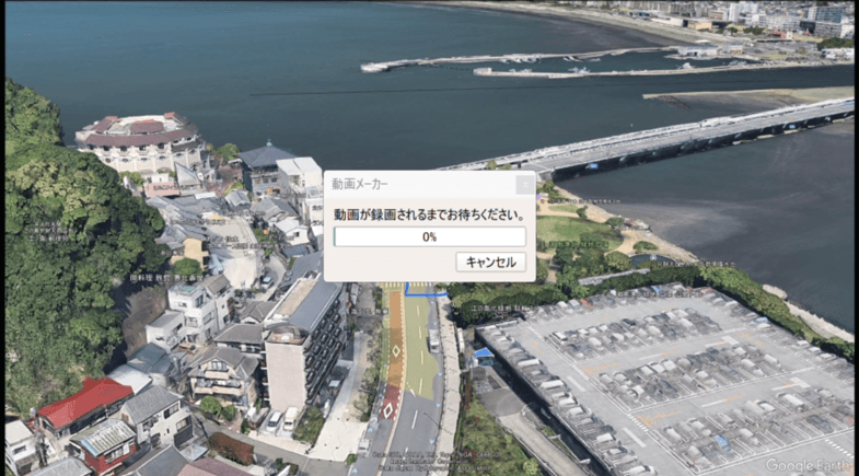 はい、このようにGoogle Earth Proを使えば、Googleマイマップで作成したルートのKMLファイルを使って、リアルな空撮風地図動画を作成できます。