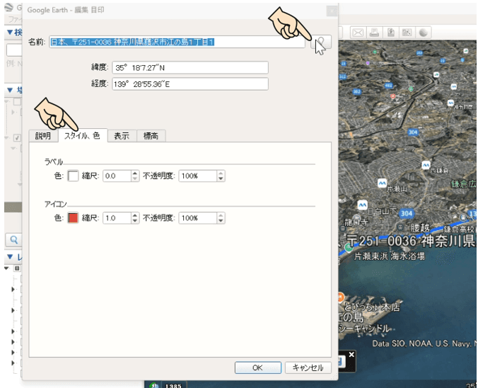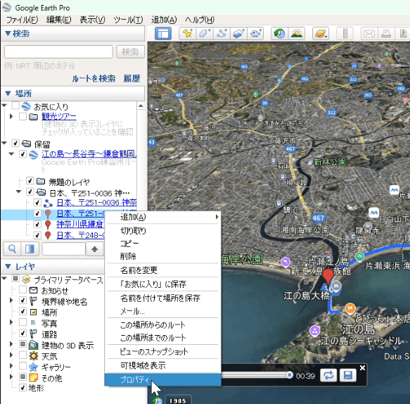 次の画像のように、「場所」パネルの中の江の島の住所がある行を右クリックすると、メニューが出ますが、その中から「プロパティ」を選びます。