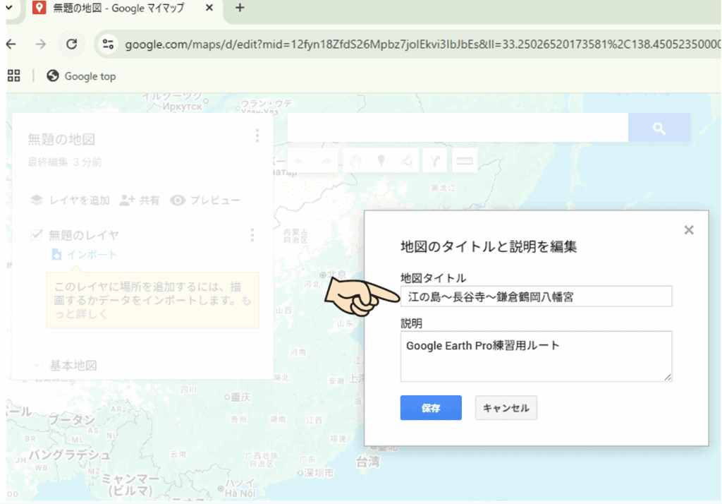 それには、左上の「無題の地図」をクリックして、表示されるメニューに地図のタイトルや説明を記入し、『保存』をクリックします。
