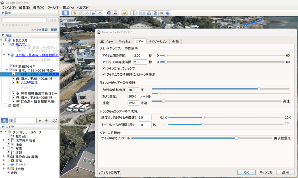 | ⑥ | Google Earth Pro | ツアーのカメラ設定を調整 | [ツール] → [オプション] → [ツアー]で傾斜角度や速度を設定 |
