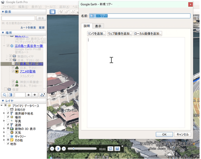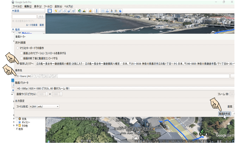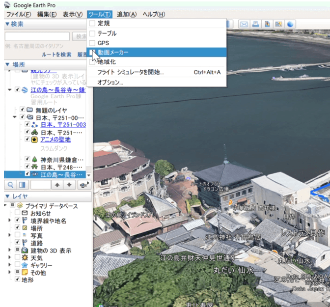 Googleマイマップで作成したKMLファイルを使えば、Google Earth Proでそのルートを3Dマップ上に表示し、空撮したかのような動画として再生・録画することができます。