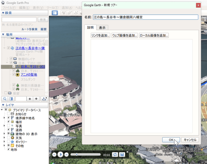 この例では、ツアーの名前を「江の島~長谷寺~鎌倉鶴岡八幡宮」とし、OKボタンをクリックしました。