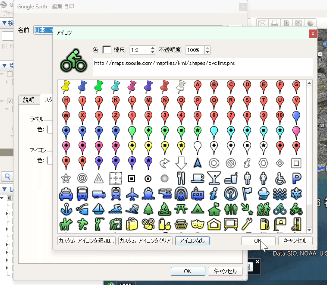 色々なアイコンが表示されますが、ここでは例として、自転車の形のアイコンを選んで、『OK』を押します。