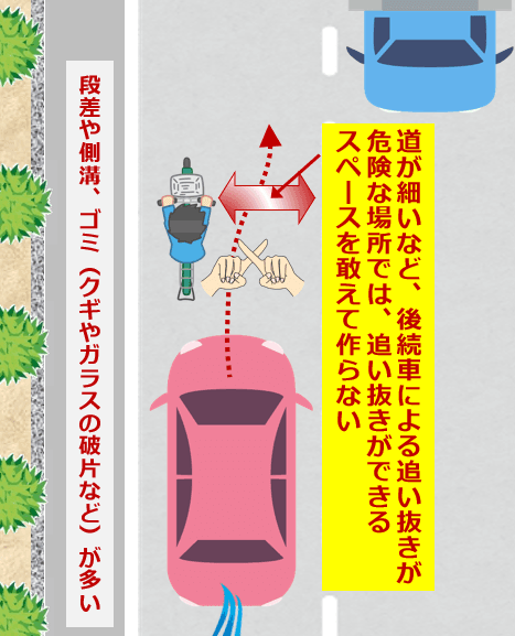 ですので、道が狭く、ここで追い抜きをして欲しくないといった場合には、後続車が追い抜きができない程度に真ん中寄りを走りましょう(次の図)。