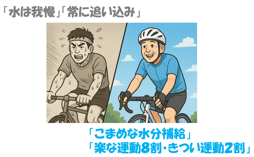 今の常識:喉が渇く前から、こまめに水分と電解質を補給するのが鉄則