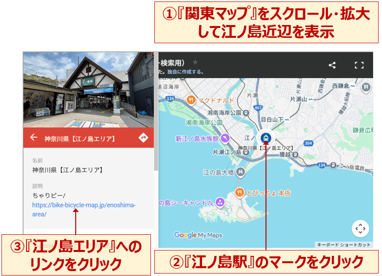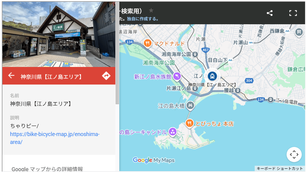 『江ノ島駅』のマーク(電車の形)をクリックすると、次の図のように、画面の左側に『江ノ島エリア』へのリンクが表示されます。