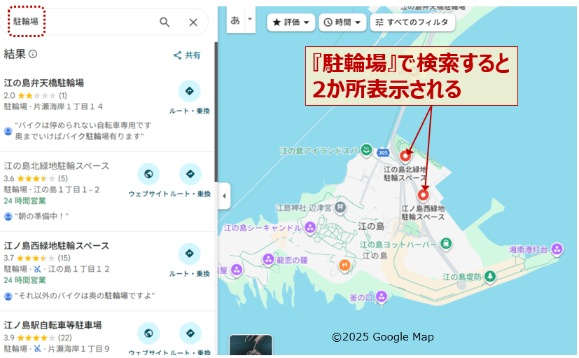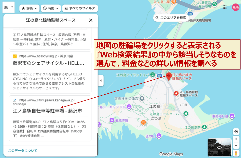 具体例を江の島で駐輪場を探す場合でお見せします。