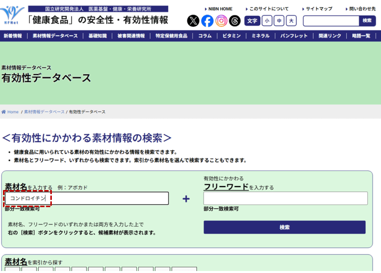 国立研究開発法人 医薬基盤・健康・栄養研究所 『有効性データベース』のスクリーンショット